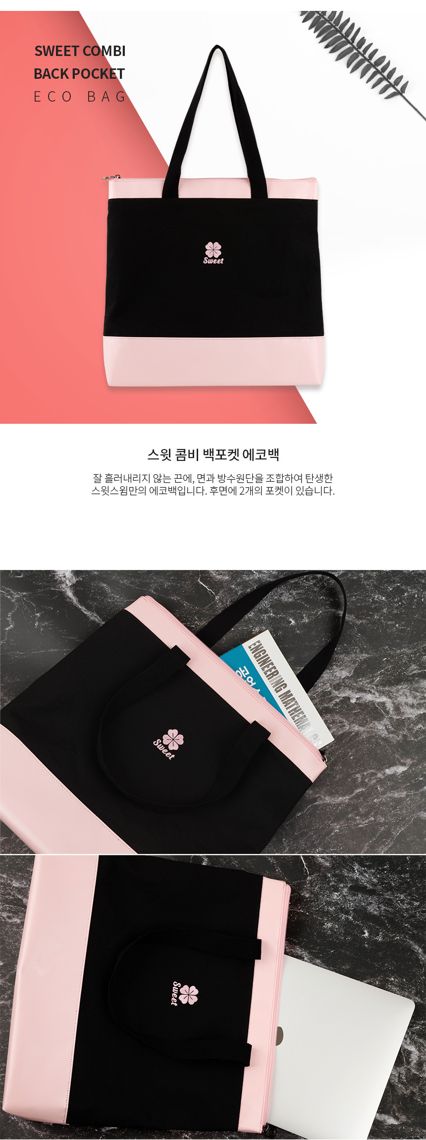 가방 뒷면에 2개의 포켓과 밑, 윗단에 타포린 원단을 조합하여 만든 에코백입니다.